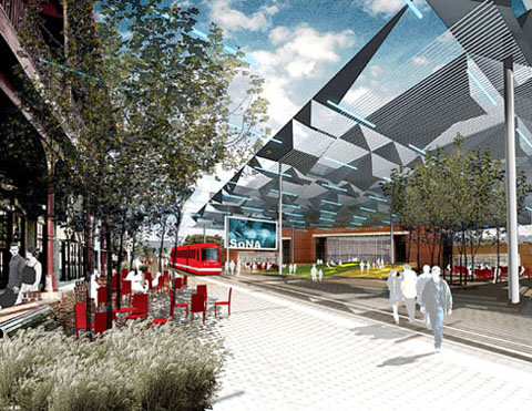 In Fayetteville 2030: Transit City Scenario, the remote Walton Arts Center is integrated into the new shared street through a covered transit plaza. (Image courtesy UA Community Design Center) The University of Arkansas Community Design Center's project Fayetteville 2030: Transit City Scenario won an honorable mention in the 2012 Charter Awards. The awards program was sponsored by the Congress for the New Urbanism (CNU), the leading international organization promoting walkable, mixed-use neighborhood development, and sustainable communities.